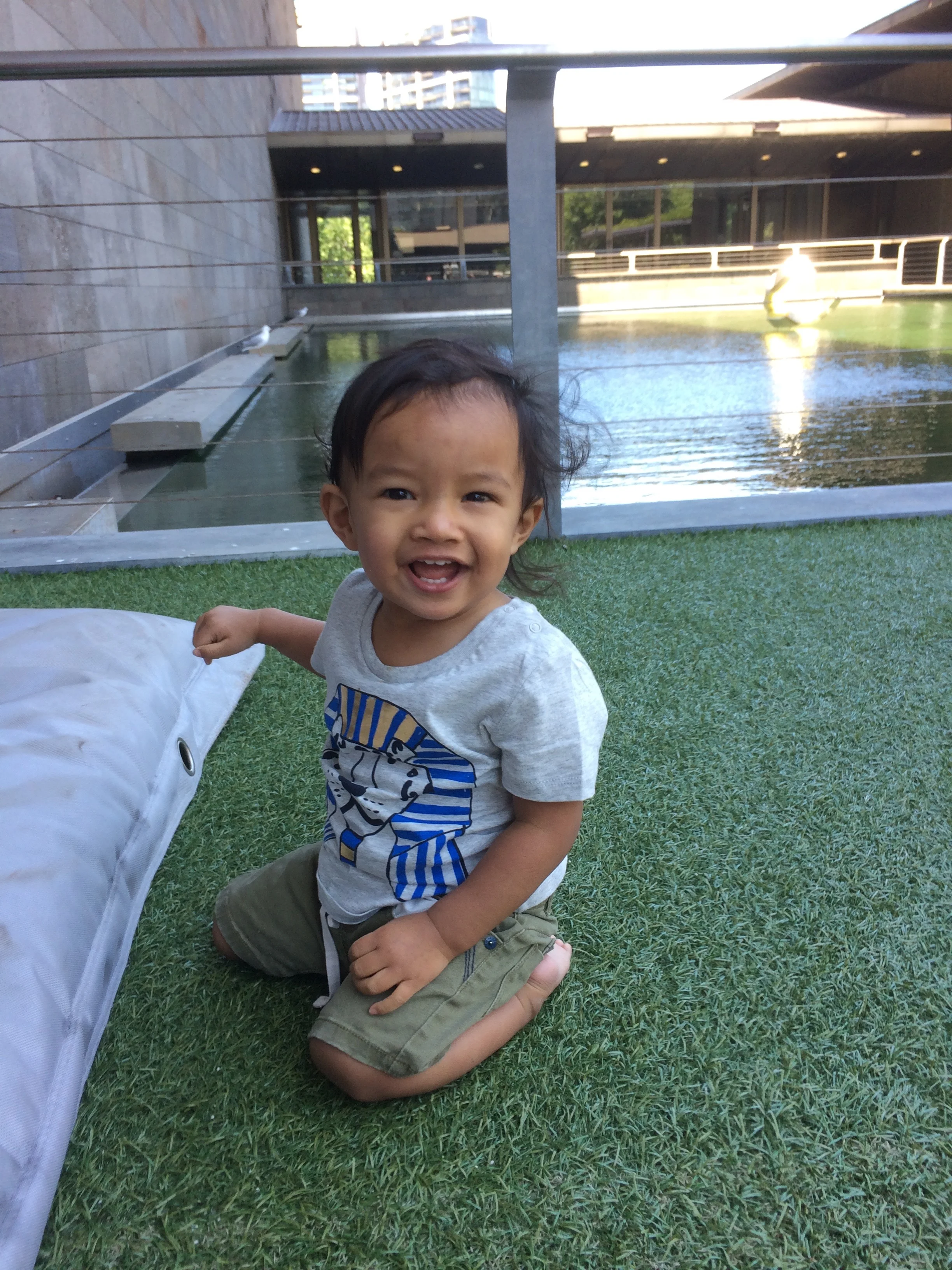 Jai's doing a lot of cruising and pulling himself up to standing, which is great. Spending a lot of time exploring textures.. pine bark, sand, different carpets, metal grills to roll cars on... He enjoys playing outside on our balcony, but if left alone, he makes his way to the fish pond and splashes the water. Fun for him, not so much for the fish!